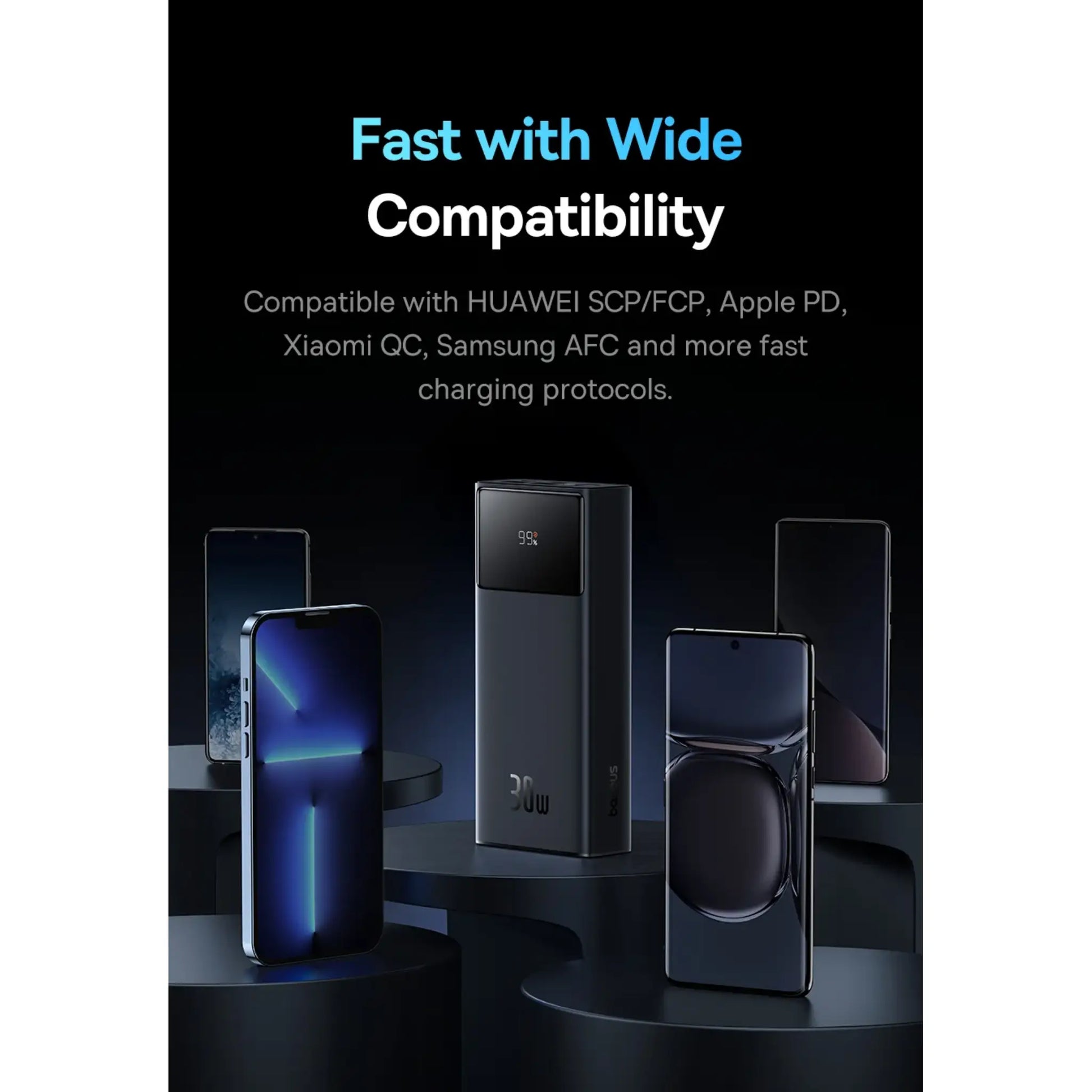 No matter, if you are an Apple user, an Android user, or anything in between, Baseus Star-Lord Digital Display Fast Charging Power Bank 30000mAh 30W is compatible with a wide range of devices like phones, tablets, Bluetooth headphones, and more. You can easily monitor your power bank's battery level using the built-in digital display. Feel reassured knowing that the Baseus Star-Lord's advanced safety features protect your devices from overcharging, overheating, and short circuits.