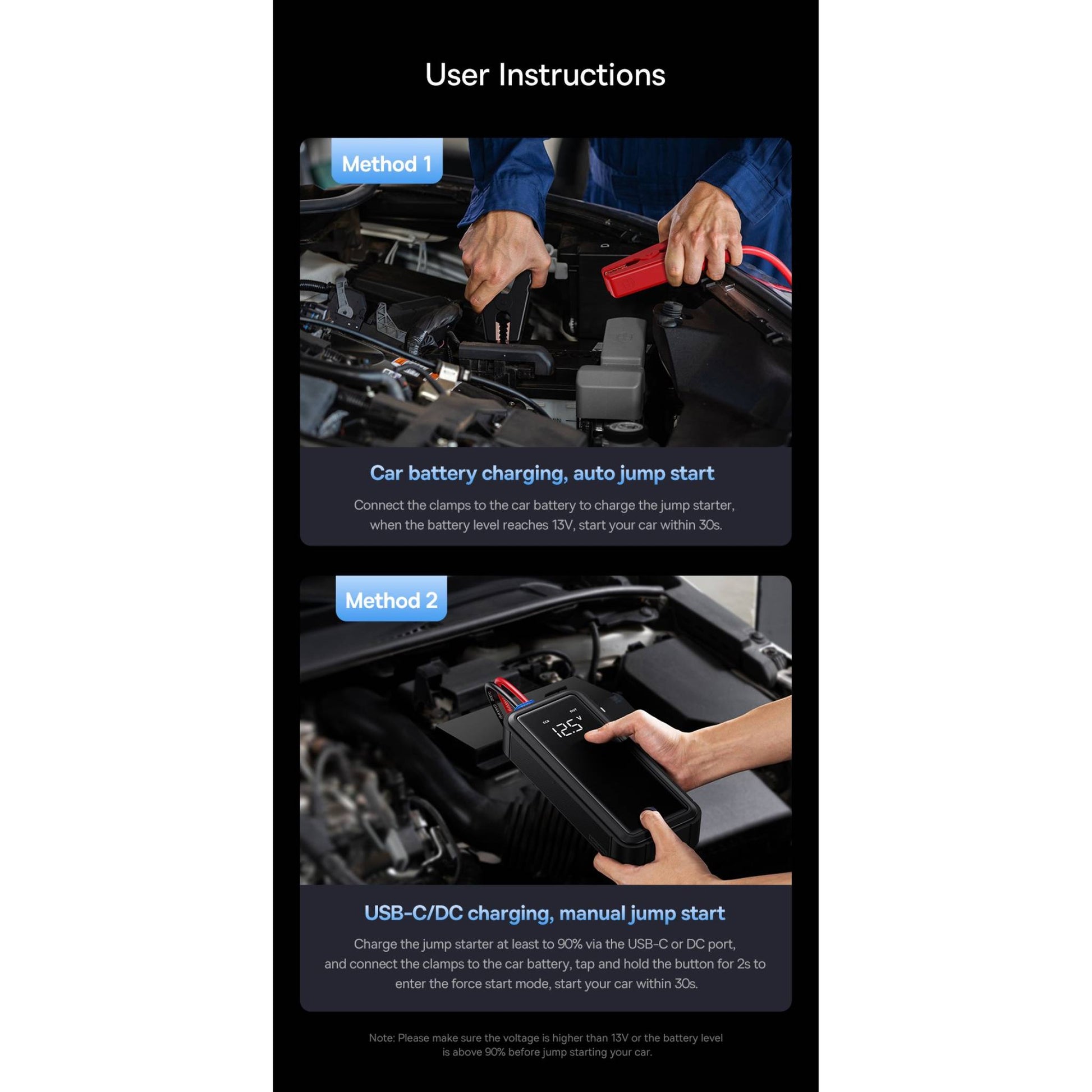 - Fully charging within 3 minutes through clamp charging, 5 minutes via DC port charging, and 30 minutes via USB-C port charging