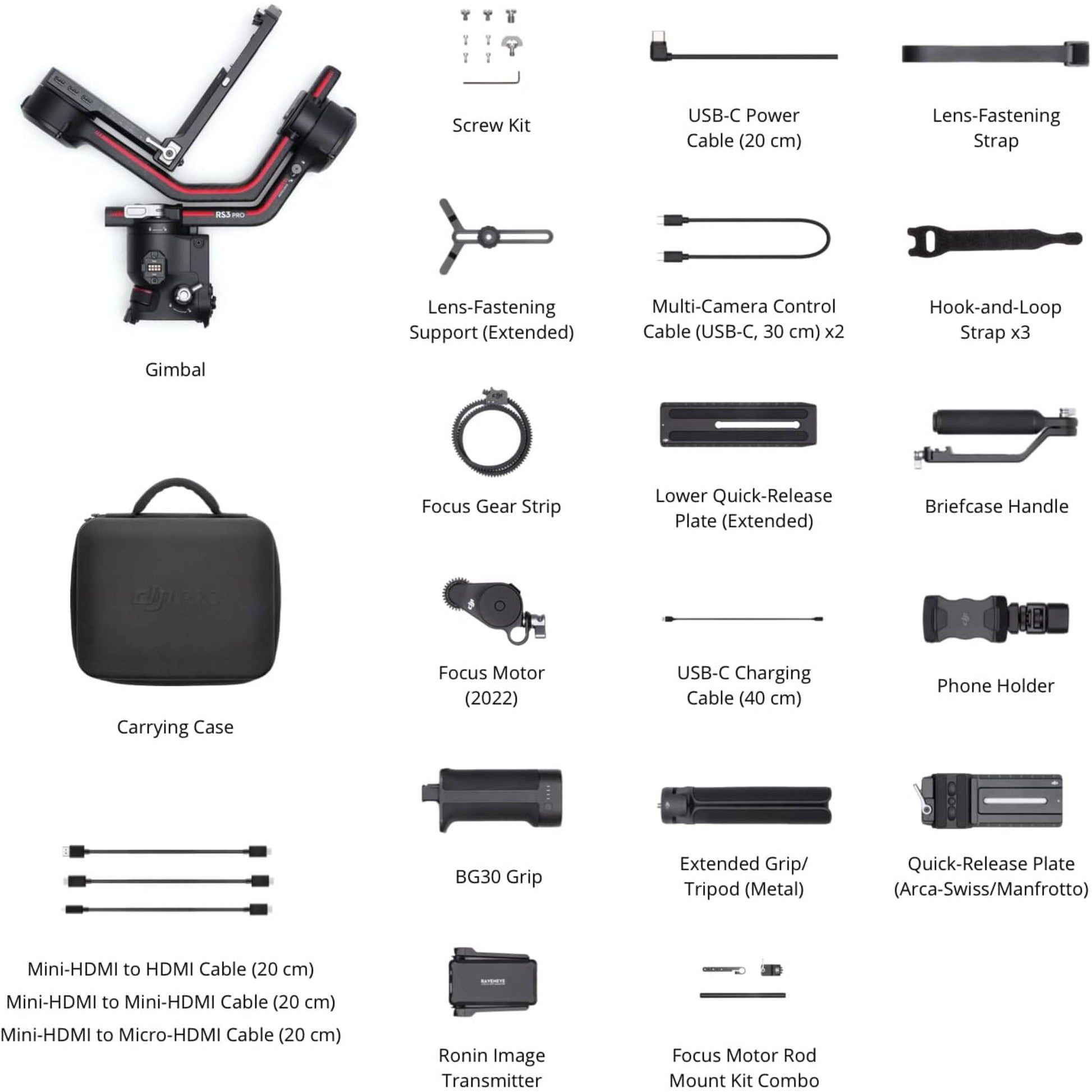 The RS 3 Pro Combo includes: RS 3 Pro Gimbal, Focus Motor, Grip Extension, Carrying Case, Ronin Image Transmitter Mount, and all necessary cables for professional filmmaking right out of the box.