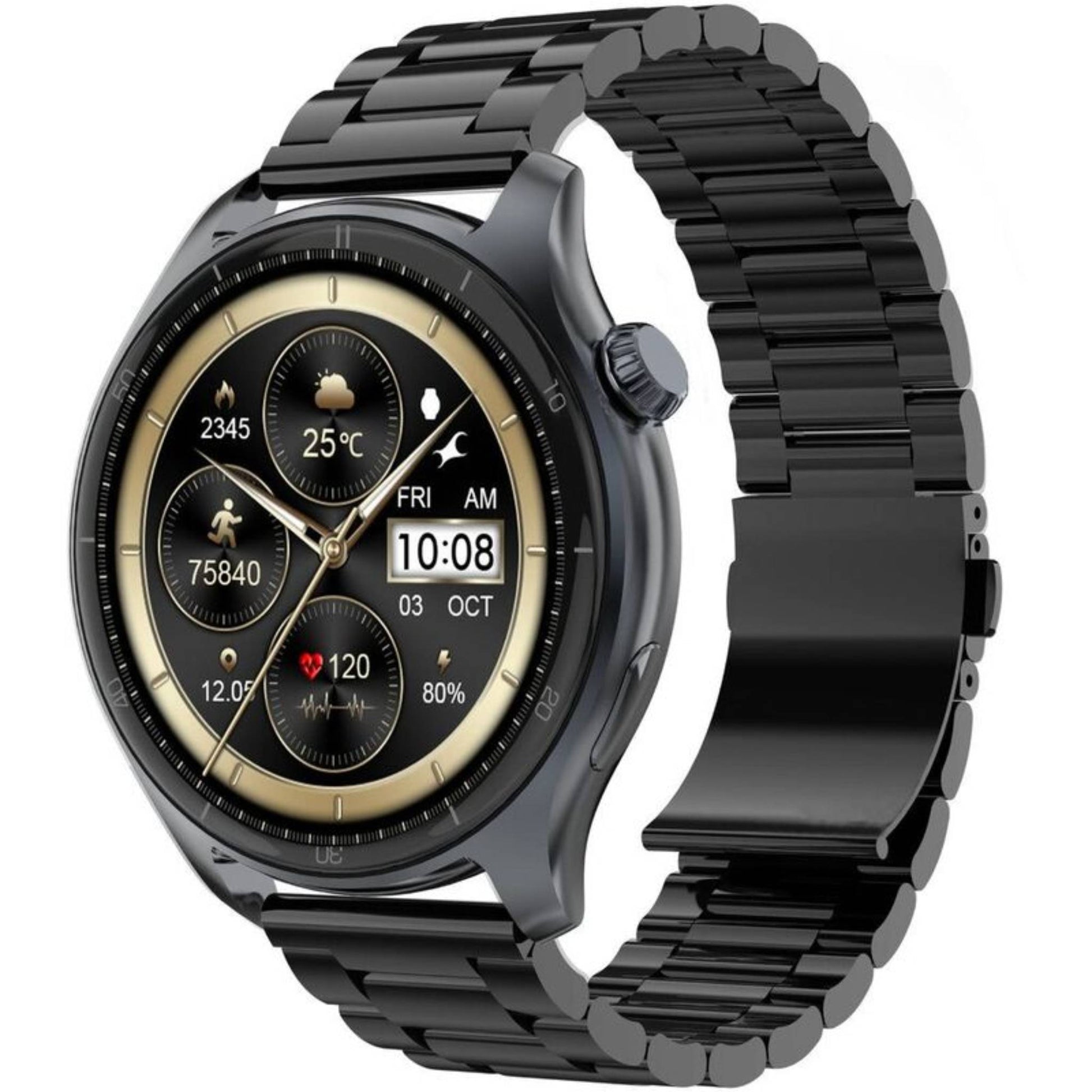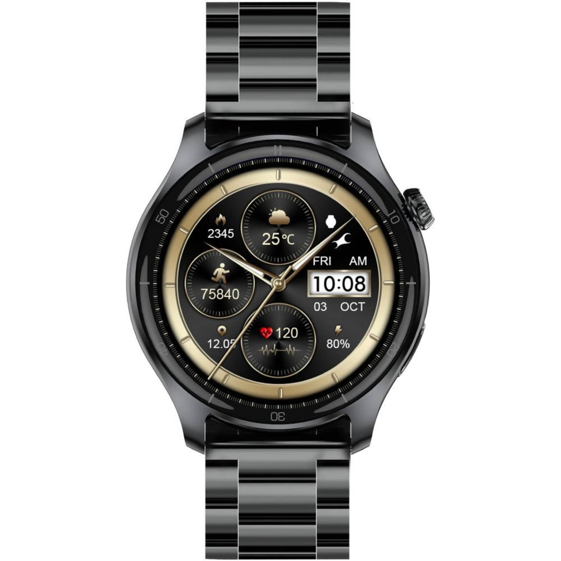 Fastrack Elite Smartwatch with a 1.43″ HD round display, always-on display (AOD), Bluetooth calling, weather updates, daily activity tracking, and a premium metal strap.