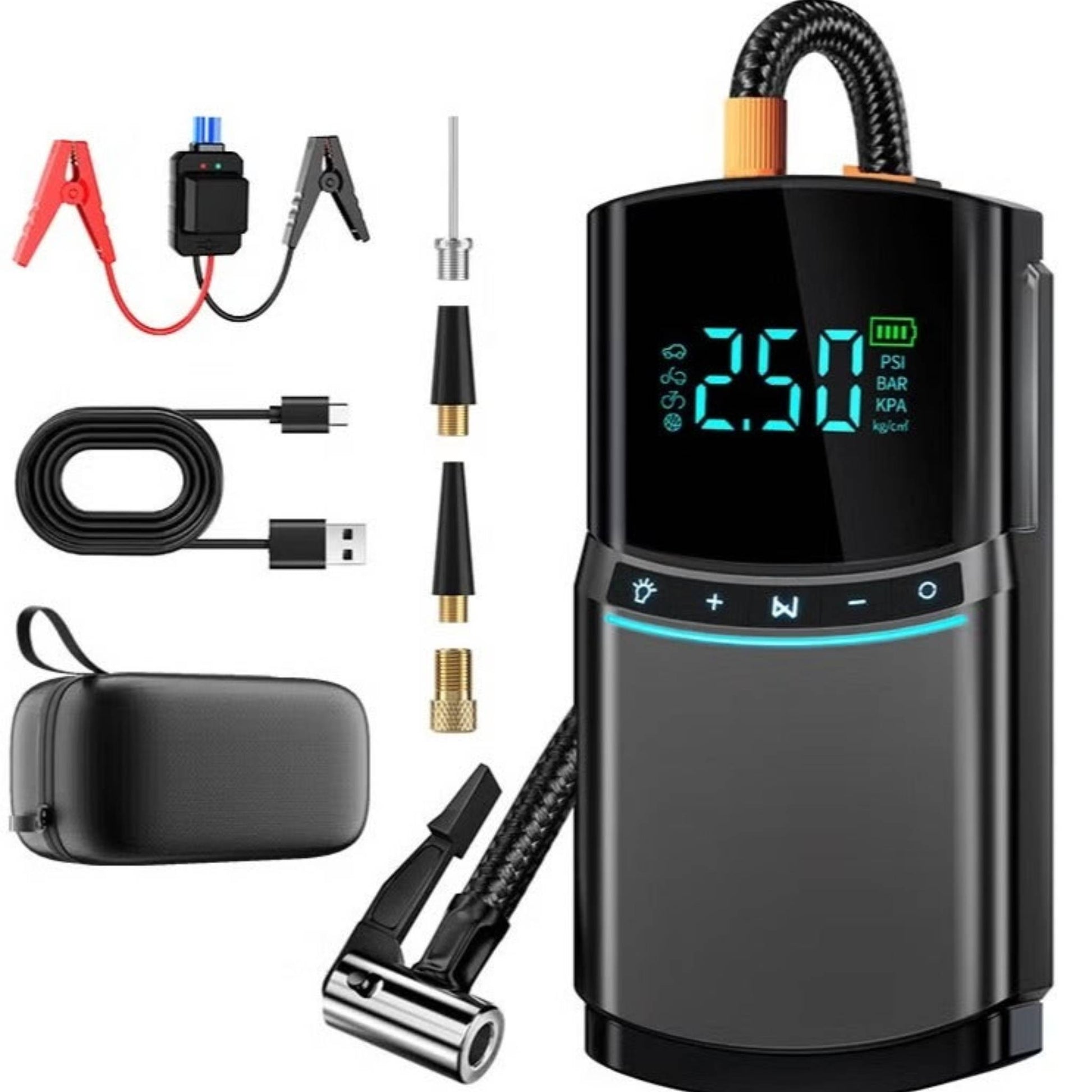 The integrated tyre inflator is a true game-changer. Capable of delivering up to 150 PSI of pressure, it can inflate a car tyre from flat to full in just a few minutes. The air compressor operates at approximately 25L/min, making it perfect for fast inflation of not just vehicle tyres but also motorcycles, bicycles, balls, air mattresses, and inflatable toys.